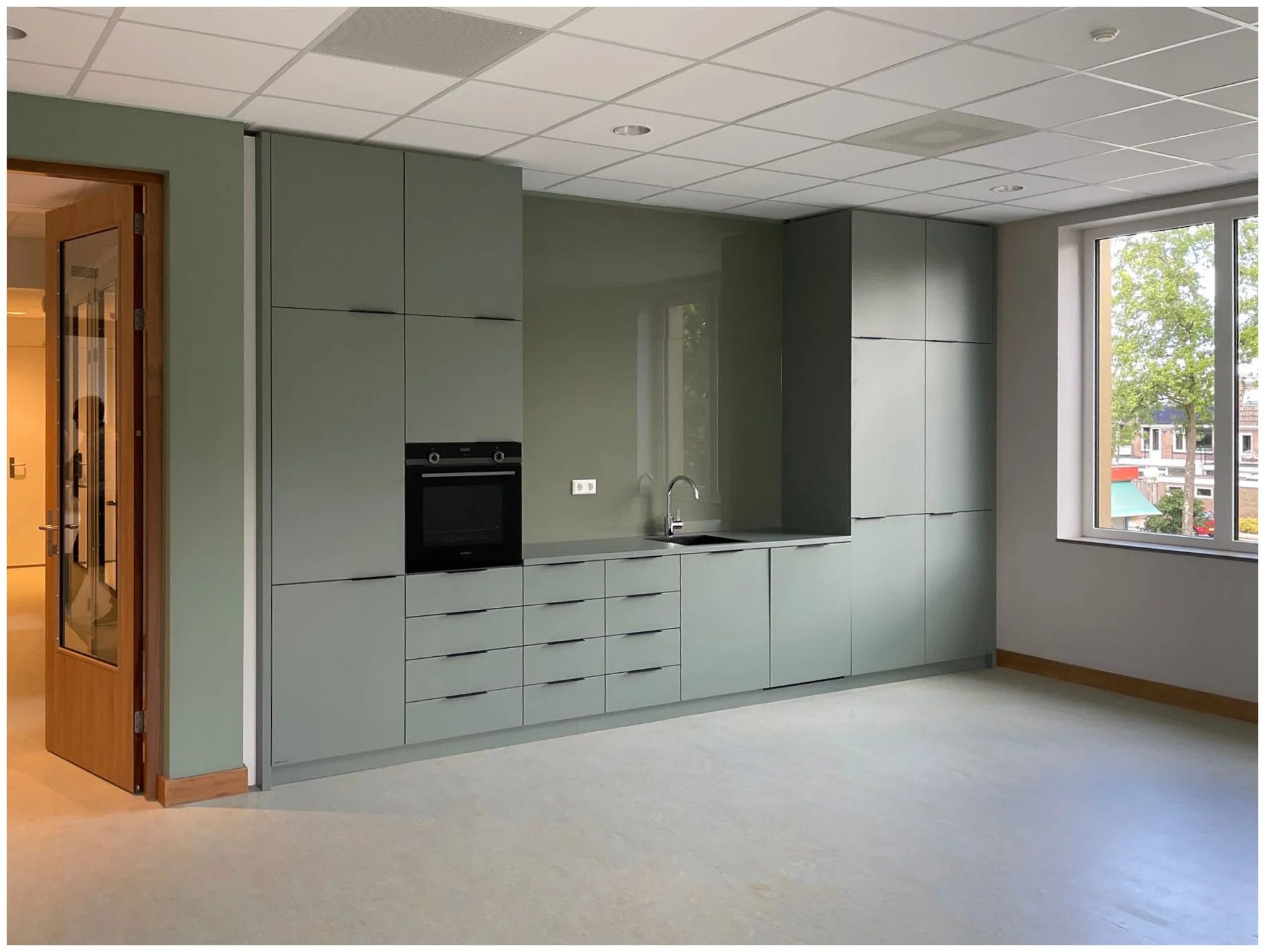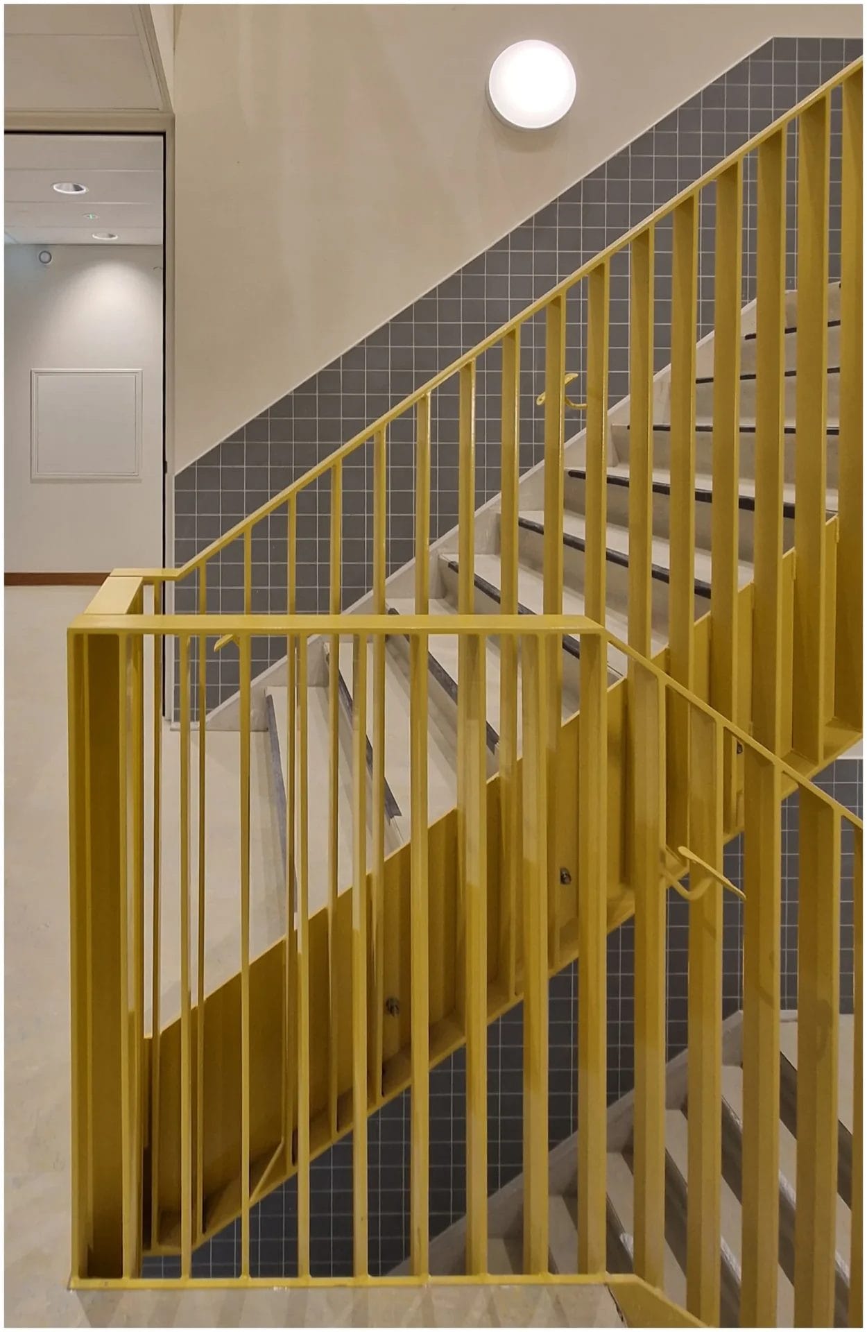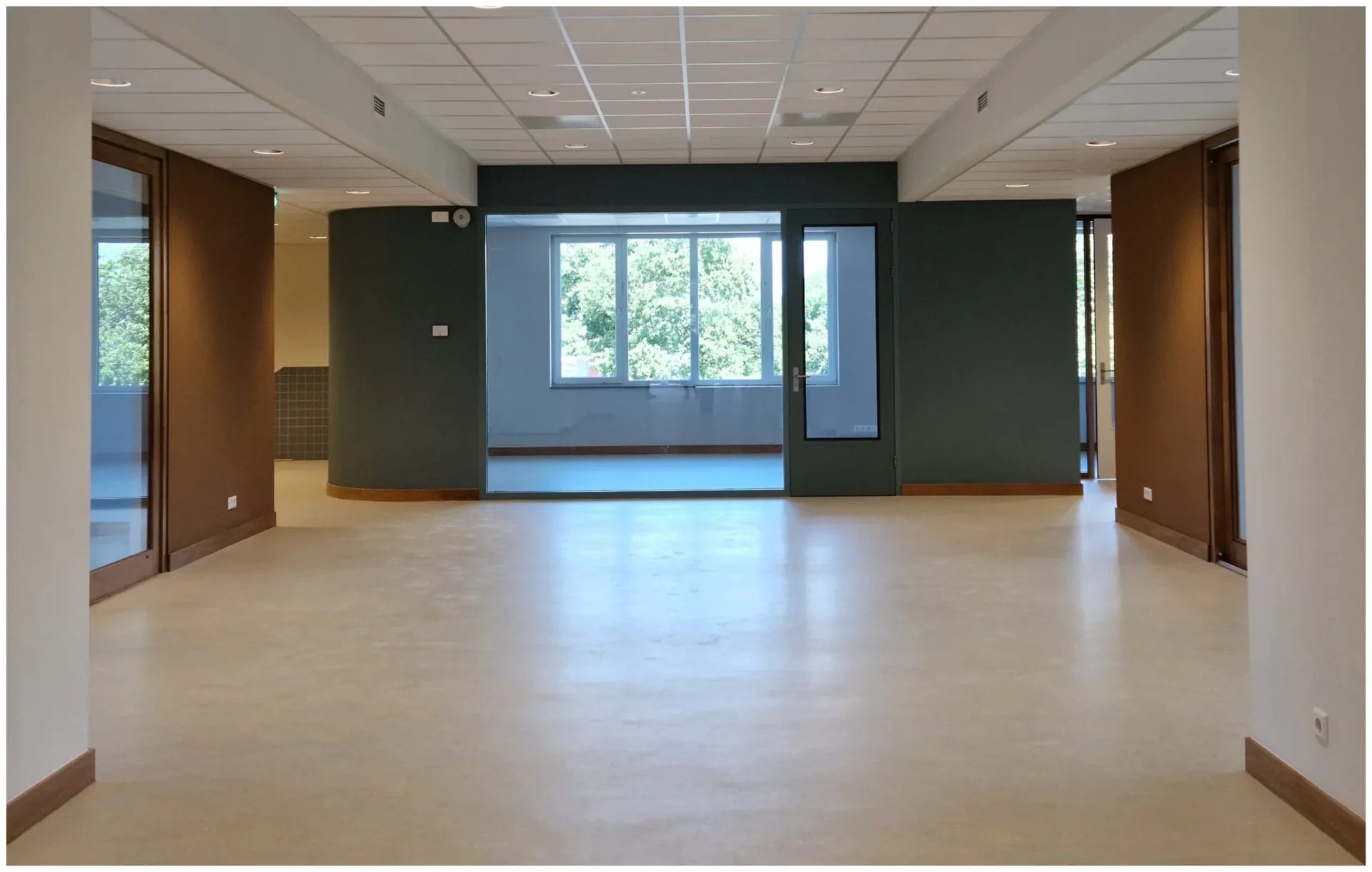 Voor het interieur kozen we voor warme, levendige kleuren in combinatie met hout. Zo ontstaat een omgeving waarin kinderen zich thuis voelen—de ideale basis om te leren en zich te ontwikkelen. Tegelijk is het gebouw duurzaam en toekomstbestendig ontworpen, met robuuste materialen zoals betegelde lambriseringen en hoge houten plinten. Op bijzondere plekken, zoals het speellokaal en in de trapleuning, zijn speelse accentkleuren toegevoegd.
