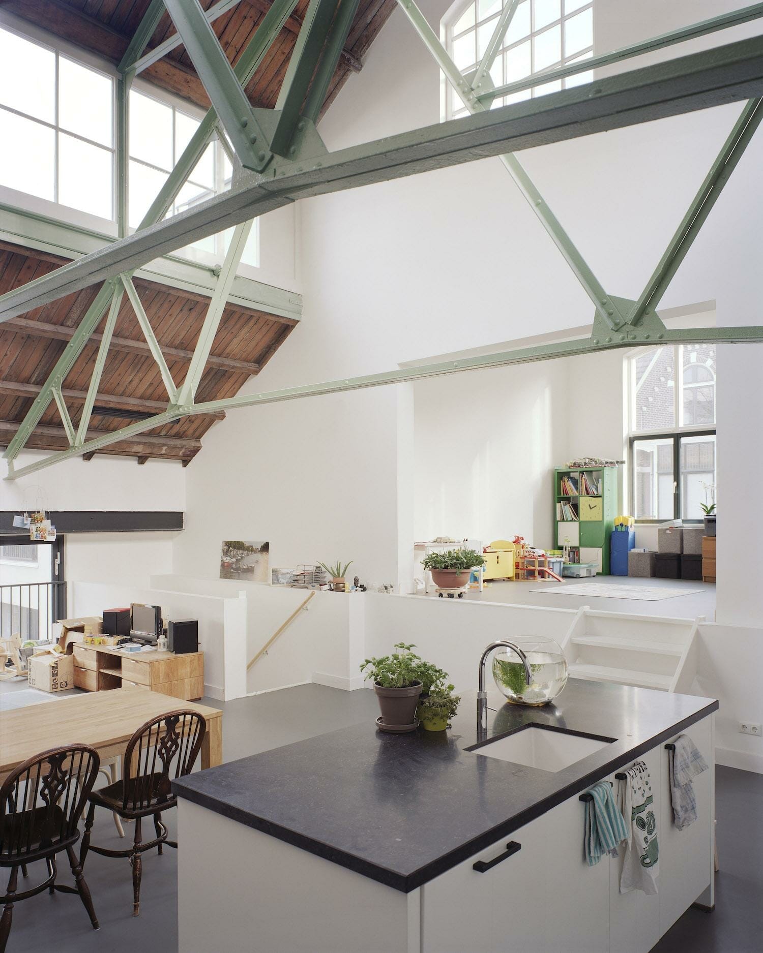 Bij de transformatie wilden we de structuur en de eigenheid van de oude fabriek zoveel mogelijk behouden. Het complex bestond uit grote, hoge hallen met veel volume en prachtige kapconstructies van hout en staal maar met weinig daglicht en geen mogelijkheid voor een buitenruimte. Hoe creëer je daar woningen in? Met een paar strategische ingrepen hebben we dit opgelost. Zo is een weinig karakteristieke hal op het binnengebied gesloopt. Hiervoor in plaats is een nieuw Leids hofje gerealiseerd. Vanwege dit hofje verdween de noodzaak om iedere woning van een grote buitenruimte te voorzien.