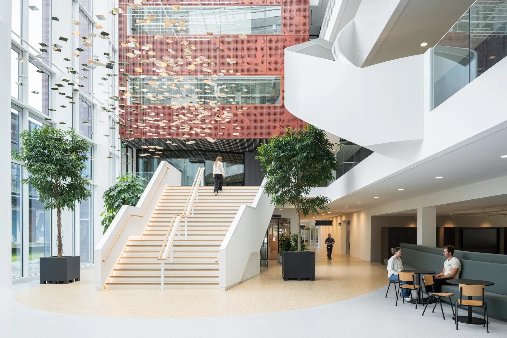 Collegezalen, practicumruimten, de bibliotheek en zelfstudieruimten geven in het interieur uitdrukking aan het veelzijdige karakter van de faculteit. In de zelfstudieruimten en bibliotheek is er rust en zorgt de uitkijk op de groene hoven voor een prettig verblijf. In de kantoorvleugels dragen de warme kleuren en materialen van samenwerkplekken en huiskamers bij aan een uitnodigende sfeer.