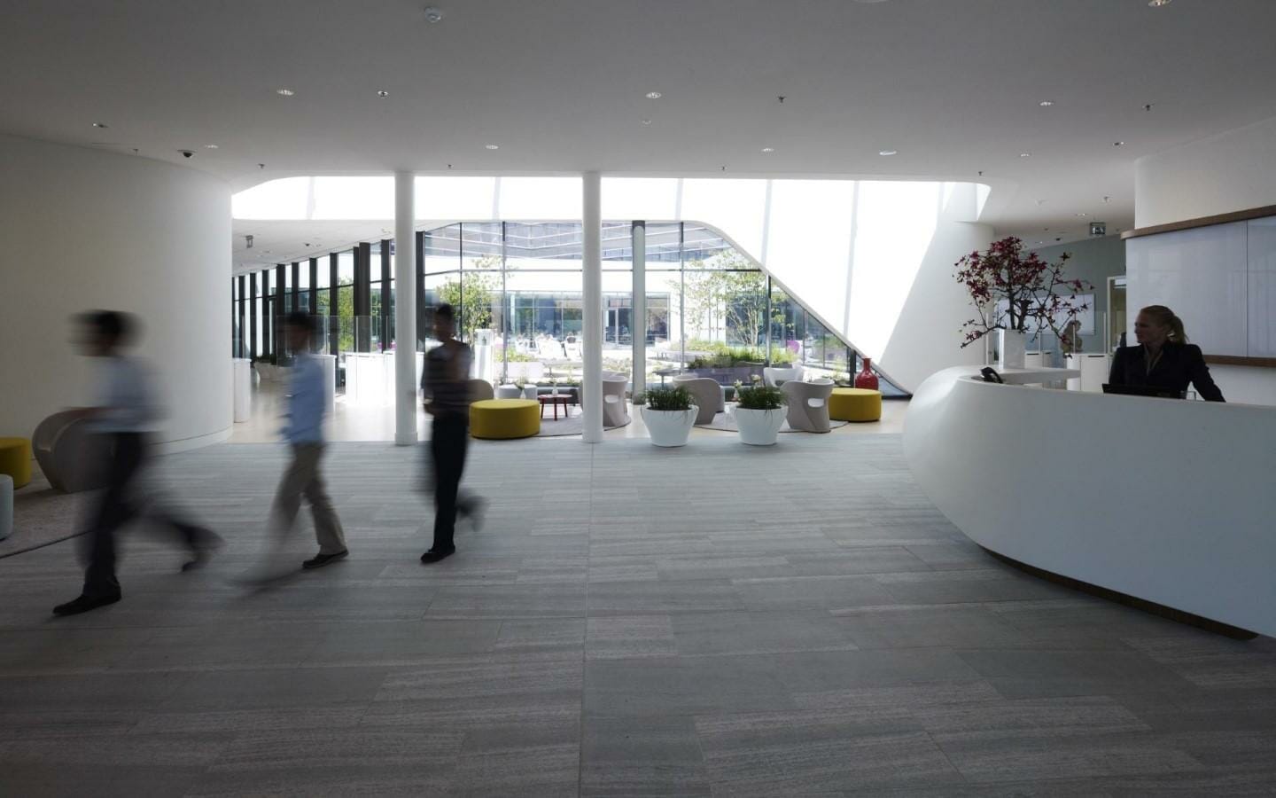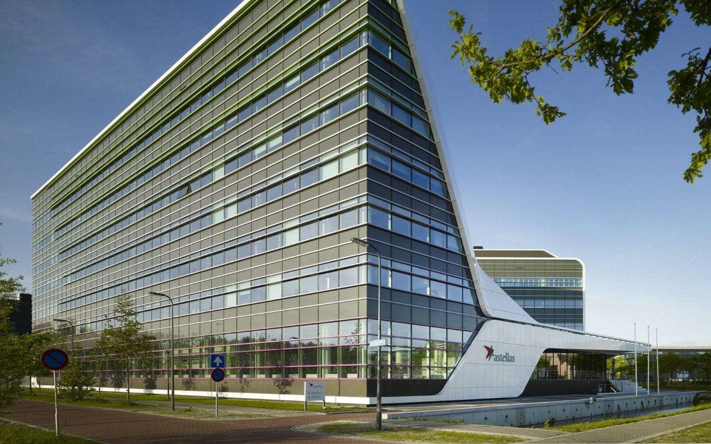 Het Japans farmaceutisch bedrijf Astellas is centraal op het Bio Science Park gehuisvest in een markant gebouw. De hoge kantoorvleugel en de laboratoriumvleugel vormen samen een V. De uiteinden van de beide vleugels omsluiten de lage entreezone. Tussen deze drie zones ligt een tuin met terras. De oriëntatie van de vleugels is afgestemd op de zon.
